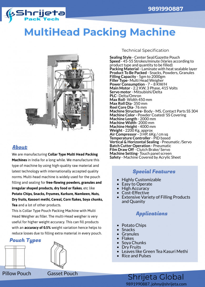 Shrijeta Global is the top manufacturer and exporter of automatic pouch packaging machines and equipment in Faridabad, India We offer a wide range of customized packing machinery for various products like powder, liquid, paste, granules, etc in pouch, bag or carton boxes.