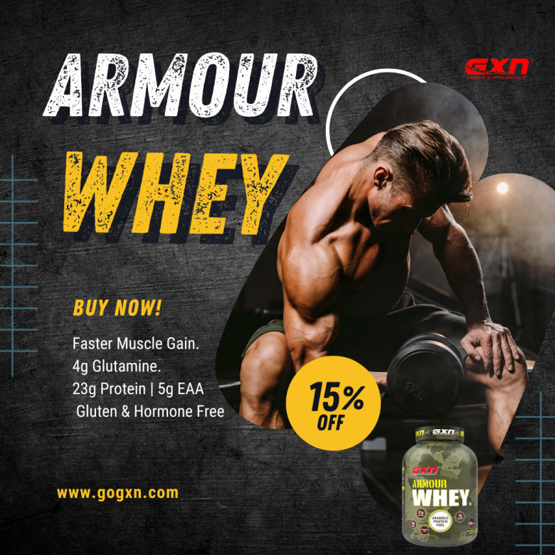 Armour Whey is rated as Best Whey Protein in India. It provides the adequate amount of high quality protein to gain lost muscles and recovery. Best Whey Protein delivers 23g protein, 5g EAA, 4g glutamic precursor in each scoop. Buy now online from GXN with discounts and freebies.