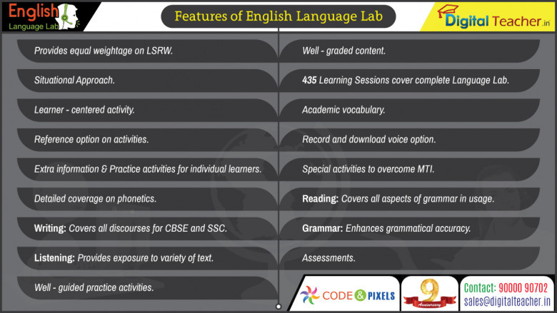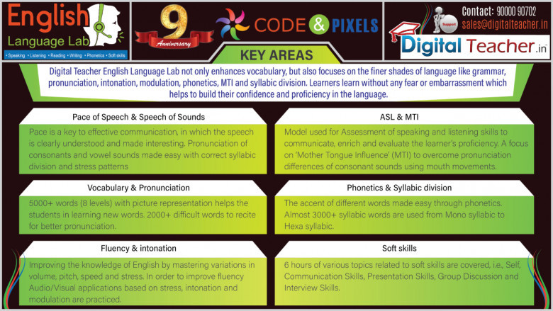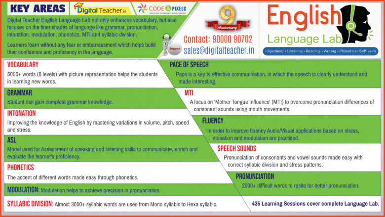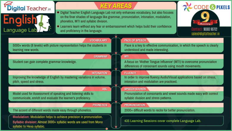 Digital Teacher English Digital Language Lab not only enhances vocabulary, but also focuses on the finer shades of language like grammar, pronunciation, intonation, modulation, phonetics, MTI and syllabic division. Learners learn without any fear or embarrassment which helps to build their confidence and proficiency in the language.